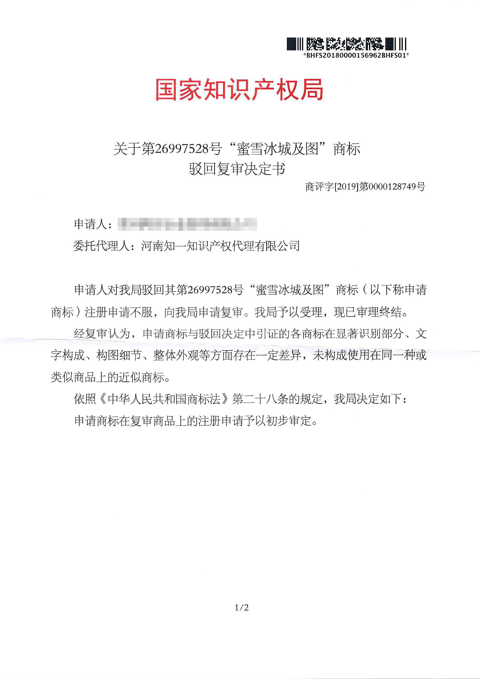 知一代理的“蜜雪冰城及圖”商標(biāo)駁回復(fù)審案喜獲成功2019-07-25